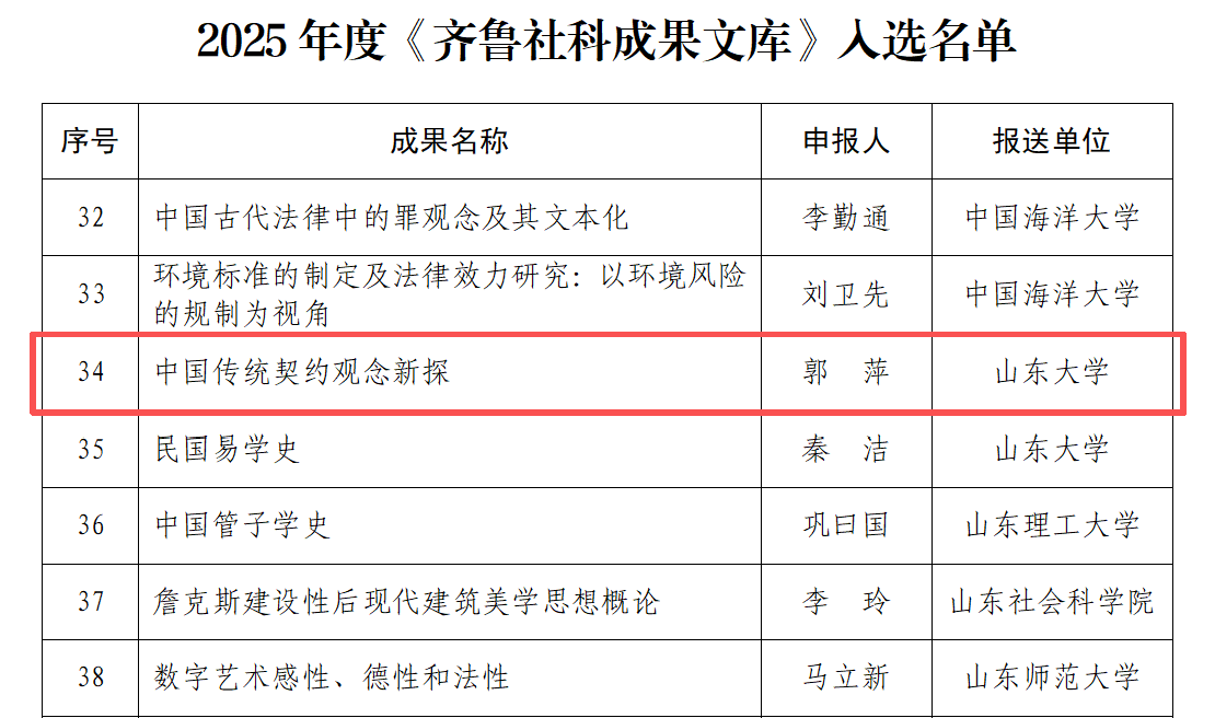 郭萍教授著《中国传统契约观念新探》成功入选。