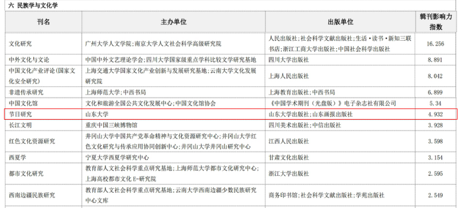 主办的《节日研究》入选民族学与文化学学科高影响力学术辑刊,影响力指数为4.932,排名上升至第6位。