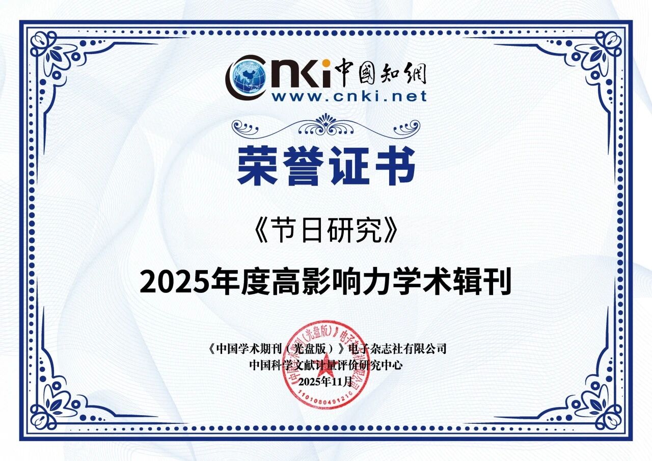 负责编辑出版,每年定期出版两辑。本刊始终坚持以党和国家哲学社会科学工作方针为指导,秉持学术性、开放性与实践性相结合的办刊原则,主要刊发国内外节日研究领域的学术论文、调查报告与学术批评等成果,致力于构建一个高端、开放、深入的中国节日研究学术平台,推动节日文化理论与实践水平的提升,服务学术发展、人才培养与新时代文化建设。本刊已被中国知网(CNKI)、万方数据库等全文收录,并入选中国社会科学综合评价(AMI)入库辑刊。现任主编为龙圣教授。
