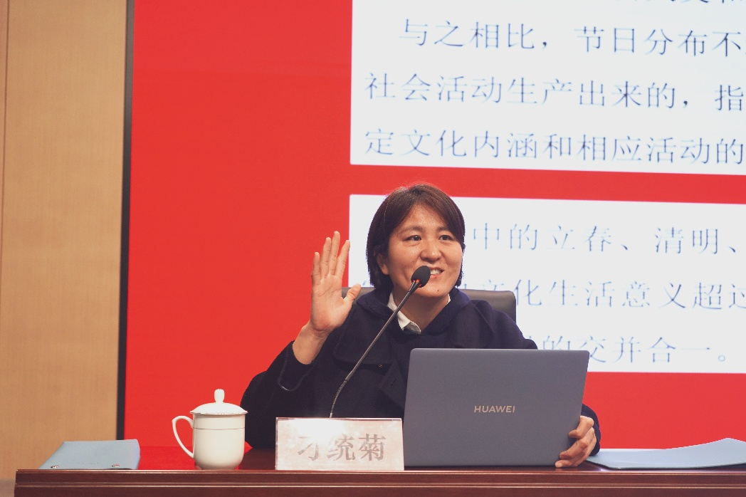 刁统菊在《冬至文化与中华美德》主题讲座中指出,冬至不仅是我国传统二十四节气之一,更是底蕴深厚的传统节日。她系统梳理了冬至从节气到节日的变化过程并指出,在长期的传承中,冬至的文化意义超越了划分季节的意义,实现了节气与节日的交并合一。在讲解关于冬至的谚语和诗词时,刁统菊表示,冬至谚语兼具预测天气变化和反映时间变化的功能,与冬至相关的诗词则承载了人们思乡怀亲、感念时节的情感。她还通过丰富的田野调查案例,介绍了全国各地“过冬至”“做冬至”的习俗。她认为,全国各地的冬至民俗和节日文化,无论是贺冬、祭祀、美食、数九、消寒,还是互赠礼物、诗词创作,都反映了百姓纯朴的天性和和谐的美感,蕴含着热爱生命、尊师重教、尊老爱幼、家国情怀等中国优秀传统美德。她表示,我们要认真贯彻落实习近平总书记关于“中华传统美德是中华文化的精髓,蕴含着丰富的思想道德资源”的指示精神,认真汲取中华优秀传统文化的思想精华和道德精髓,深入挖掘和阐发中华传统美德的时代价值,立足于中华传统美德的当代实践,使其成为涵养社会主义核心价值观的重要源泉。